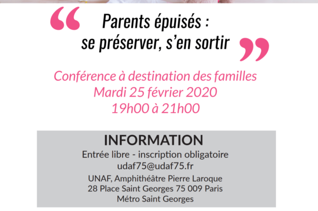 L’UDAF de Paris organise, en partenariat avec la CAF de Paris, une conférence sur le burn out parental, qui aura lieu le 25 février prochain à 19 h – en salle Pierre Laroque (28 place Saint-Georges – 75009 PARIS) Les inscriptions se font auprès du secrétariat de l’Institution par mail à : udaf75@udaf75.fr