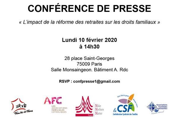 Plusieurs associations familiales dont MMM France ont organisé une conférence de presse et ont exposé leurs craintes sur la réforme des retraites. La journaliste Laurence Veldès de LCI a interviewé Mériadec Rivière, membre du Conseil d'Administration de l'UNAF (Union Nationale des Associations familiales)